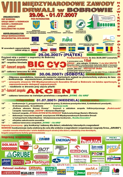 W dniach 29, 30 czerwca i 1 lipca 2007 roku, po raz VIII odbyły się największe w Polsce i Europie „Międzynarodowe Zawody Drwali w Bobrowie” (gmina Rudniki, powiat oleski, województwo opolskie). W zmaganiach o miano najlepszego drwala starego kontynentu udział wezięli zawodnicy: Czech, Słowacji, Niemiec, Francji, Szwecji, Ukrainy i Polski.